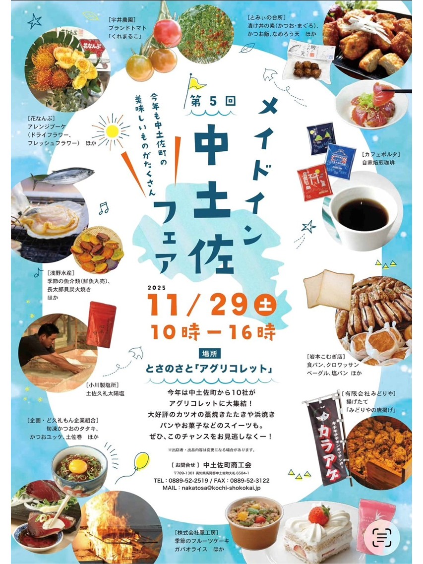 中土佐町 2025年11月13日 11月29日(土) とさのさと アグリコレット で「メイドイン中土佐フェア」を開催! 第5回目「メイドイン中土佐フェア」が今年もアグリコレットで開催されます!カツオはもちろん、パンやスイーツなど中土佐町自慢の商品が一度に勢ぞろい!こんな機会は滅多にない!!!食べたいもの、買いたいものをチラシでチェックして、29日はアグリコレットへGO!! 問い合わせ先:中土佐町商工会 TEL 0889-52-2519MAIL nakatosa@kochi-shokokai.jp